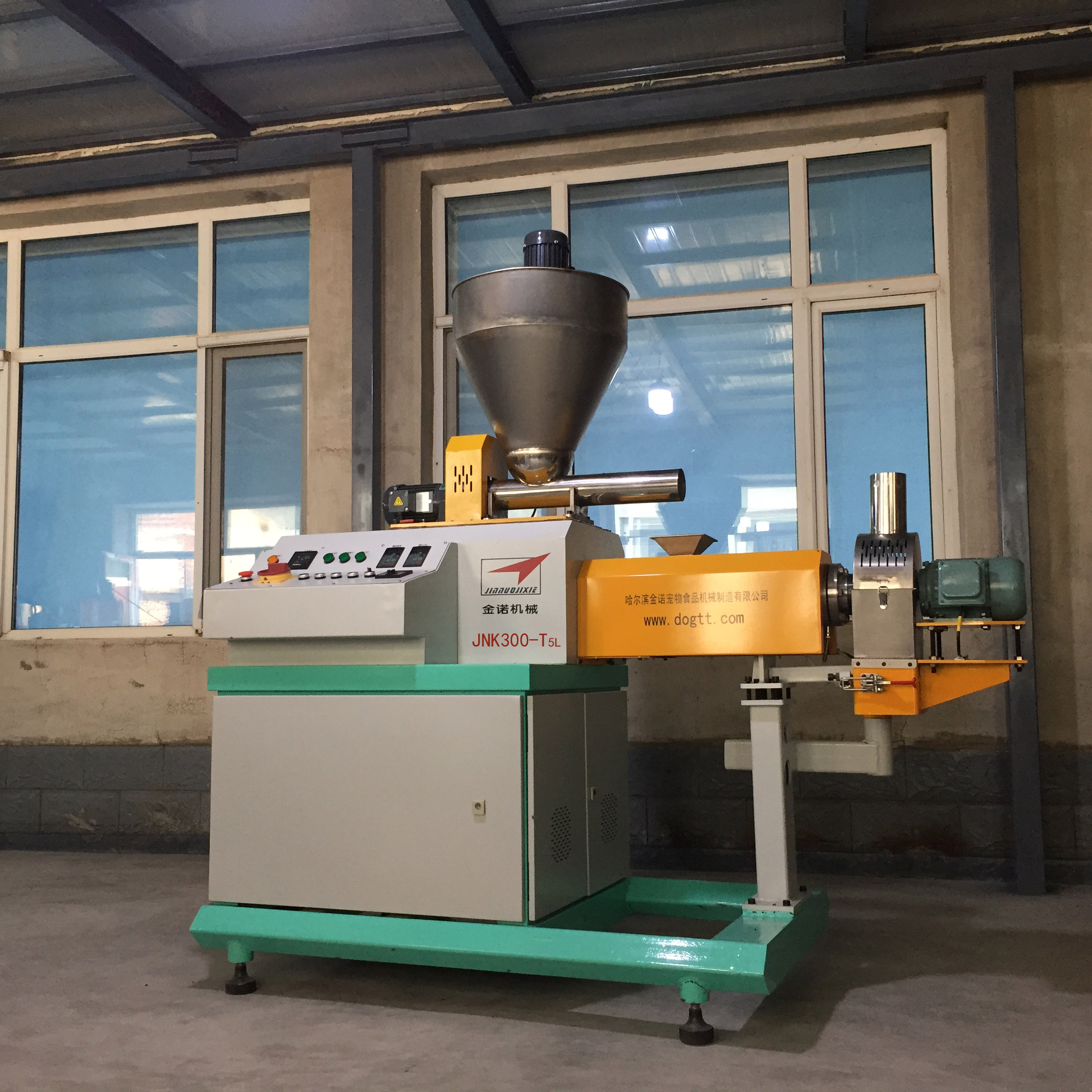 JNK500-T8寵物食品設備特點:狗糧制造機器切刀采用直角切刀技術,安裝調試更方便,狗糧機的主軸和切刀小軸均可隨時注油,延長狗糧設備的軸承使用。匹配恒溫控制機組,保證狗糧顆粒機在設定的溫度下工作,顆粒成型穩定,美觀。JNK500-T8狗糧設備每小時加工狗糧顆粒500公斤。